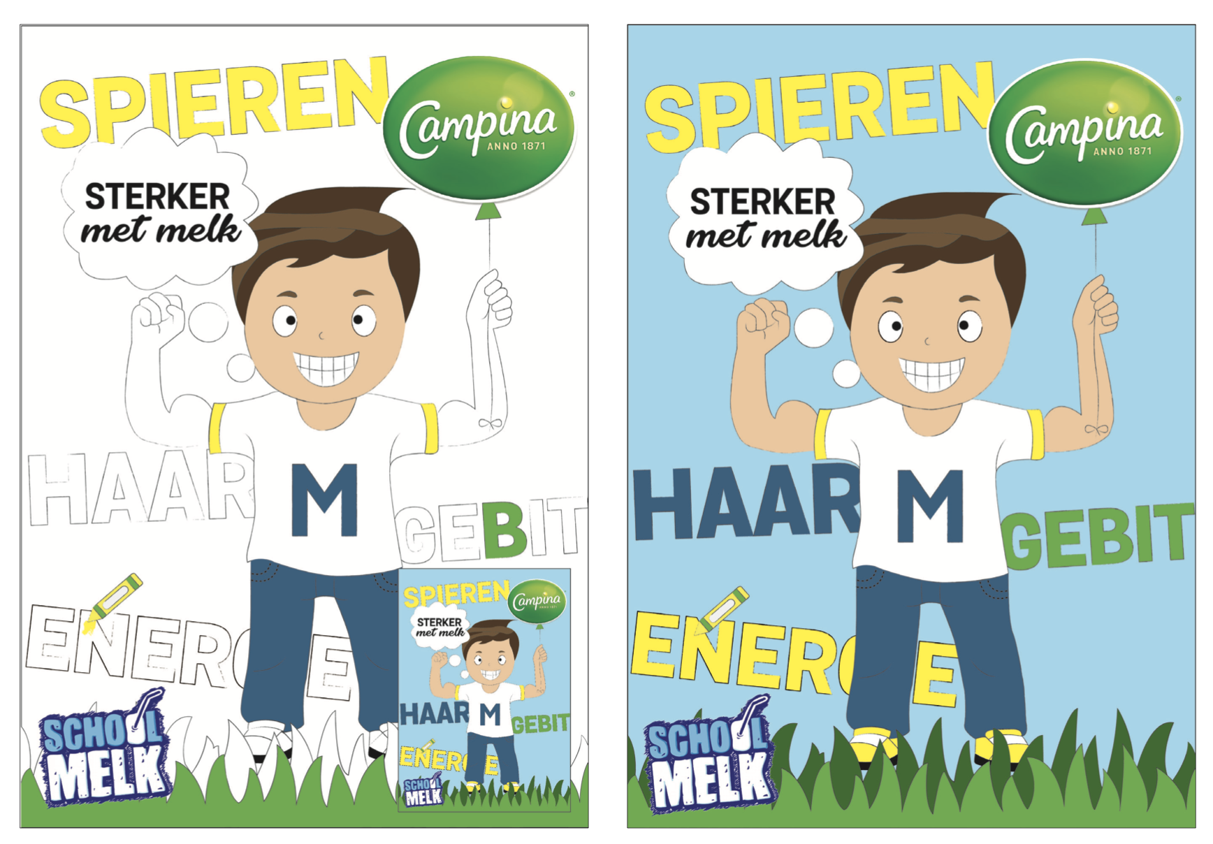 My concept focuses on making Campina School Milk appealing to preschoolers in a playful and visual way. Through a recognizable illustration and a coloring page that are central to the campaign, children are actively engaged and learn about milk in a playful way.